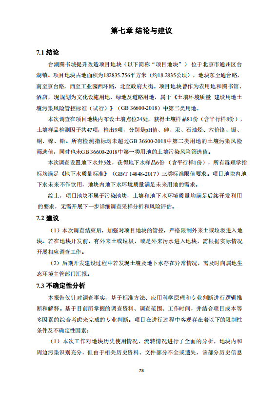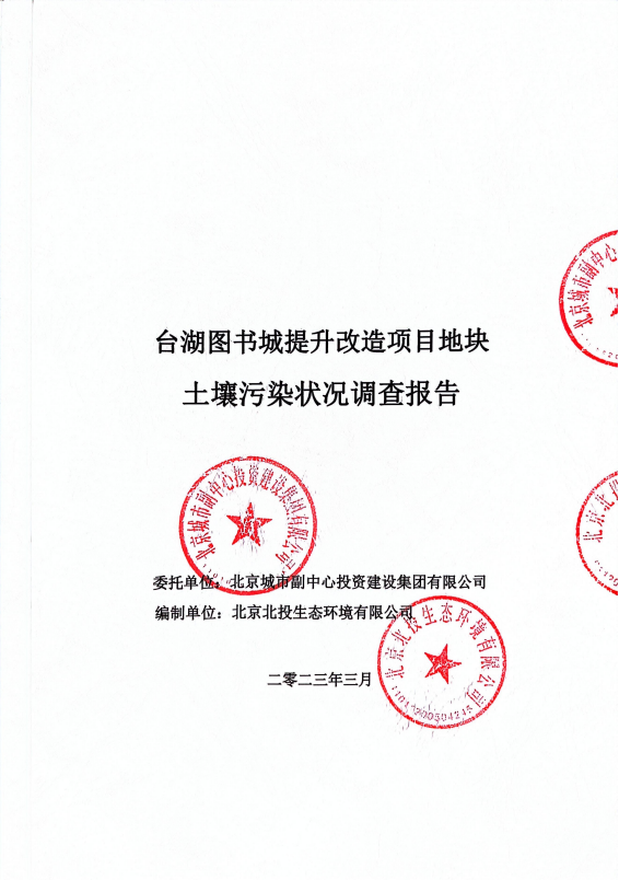 北京城市副中心投資建設(shè)集團(tuán)有限公司根據(jù)《中華人民共和國(guó)土壤污染防治法》、《污染地塊土壤環(huán)境管理辦法(試行)》(部令第42號(hào))等相關(guān)法律法規(guī)要求,委托北京北投生態(tài)環(huán)境有限公司在充分搜集場(chǎng)地歷史及場(chǎng)地環(huán)境相關(guān)資料的基礎(chǔ)上,通過(guò)現(xiàn)場(chǎng)踏勘、社會(huì)調(diào)查、勘察、采樣、檢測(cè)及相關(guān)分析等工作,編制完成了《臺(tái)湖圖書(shū)城提升改造項(xiàng)目地塊土壤污染狀況調(diào)查報(bào)告》。